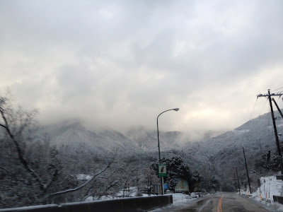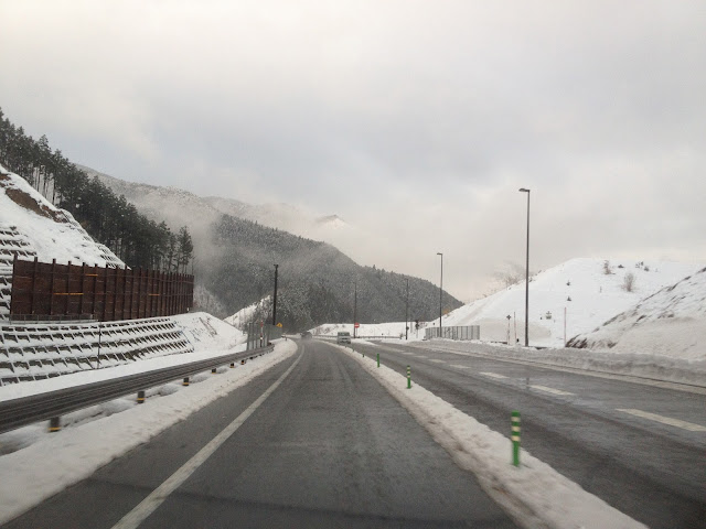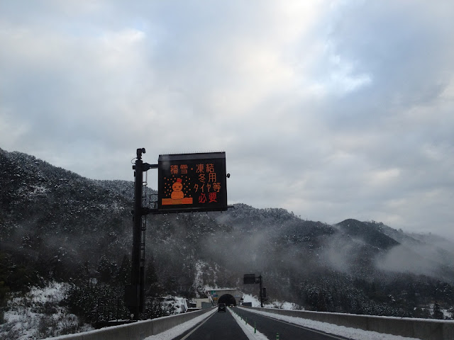 道中、見事な雪景色です。(^^;) 雨から雪に変わったり、道路も凍結寸前!